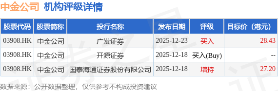 截至2026年2月4日收盘,中金公司(03908.HK)报收于21.7港元,上涨3.53%,成交量2376.84万股,成交额5.12亿港元。投行对该股的评级以增持为主,近90天内共有1家投行给出增持评级,近90天的目标均价为27.82港元。广发证券最新一份研报给予中金公司买入评级,目标价28.43港元。