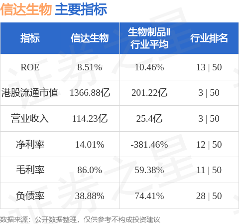 信达生物港股市值1366.88亿港元,在生物制品Ⅱ行业中排名第3。主要指标见下表: