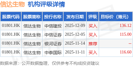 截至2026年2月4日收盘,信达生物(01801.HK)报收于80.65港元,上涨2.35%,成交量925.85万股,成交额7.39亿港元。投行对该股的评级以买入为主,近90天内共有3家投行给出买入评级,近90天的目标均价为122.57港元。中信建投最新一份研报给予信达生物买入评级,目标价136.12港元。