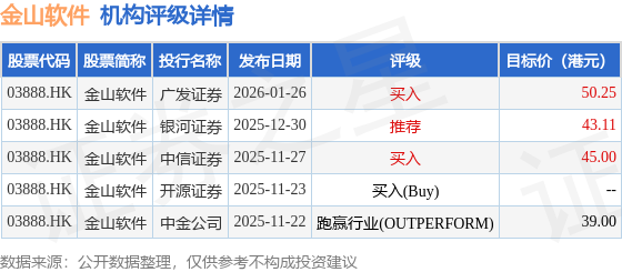 截至2026年2月4日收盘,金山软件(03888.HK)报收于27.68港元,下跌5.14%,成交量2803.08万股,成交额7.75亿港元。投行对该股的评级以买入为主,近90天内共有2家投行给出买入评级,近90天的目标均价为44.34港元。广发证券最新一份研报给予金山软件买入评级,目标价50.25港元。