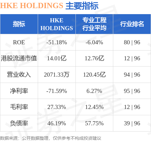 HKE HOLDINGS港股市值14.01亿港元,在专业工程行业中排名第12。主要指标见下表: