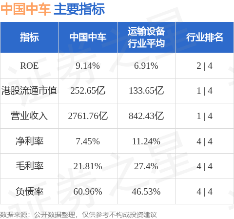 中国中车港股市值252.65亿港元,在运输设备行业中排名第1。主要指标见下表: