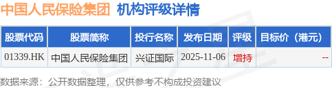 截至2026年2月4日收盘,中国人民保险集团(01339.HK)报收于6.65港元,上涨1.06%,成交量3829.0万股,成交额2.53亿港元。投行对该股的评级以增持为主,近90天内共有1家投行给出增持评级。兴证国际最新一份研报给予中国人民保险集团增持评级。