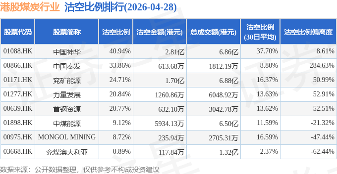 从沽空比例来看,中国神华、中国秦发、兖矿能源沽空比例位居行业前三,分别为40.94%、33.86%、24.71%。
