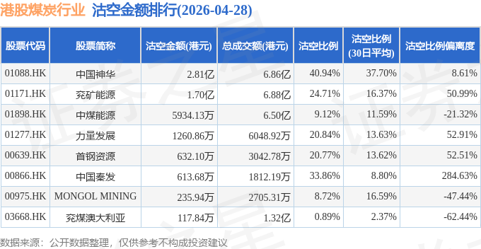 从沽空金额来看,中国神华、兖矿能源、中煤能源沽空金额位居行业前三,分别为2.81亿港元、1.7亿港元、5934.13万港元。